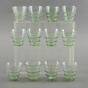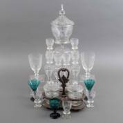 Divers glas, waaronder: bowl met geëtst decor, glaasjes met gelijkend decor, en twee groene parapluglazen