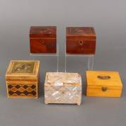 Vijf diverse theekistjes en postzegeldoosje, 19e en 20e eeuw -defecten-, parelmoer kistje 8 × 11,5 × 8 cm