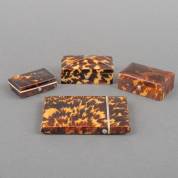 Drie diverse schildpad dekseldoosjes, waarvan één met zilveren plaquette op het deksel met de initialen J.E.d.W., en een schildpad visitekaarthouder, alle 19e eeuw -enkele kleine defecten-, afmetingen visitekaarthouder 10,5 × 8 × 1 cm