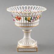Porseleinen opengewerkte mand op hoge voet met polychroom bloemdecor, uitvoering Sächsische Porzellan-Manufaktur Dresden, genummerd A8108b, 1984, 21 × Ø 20 cm