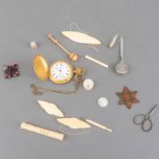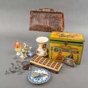Divers kleingoed, waaronder: blikken, agaat handspiegeltje, tinnen soldaatjes en porselein