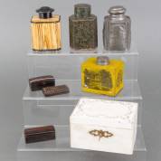Vier diverse metalen theebussen, witgelakt theekistje, twee diverse houten doosjes, en hoornen tandenstokerdoosje ingelegd met parelmoer, 19e en 20e eeuw -gebruikssporen-, theekistje 8 × 14 × 10 cm