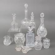 Divers kristal: karaffen, suikerpot, paar zoutvaatjes, etc. -sommige met wat aanslag binnenin, gebruikssporen-