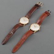 Twee verguld stalen herenpolshorloges, Certina Waterking en Certina Cal 25-36, beide met zilverkleurige wijzerplaat, beide aan bruin lederen band met gespsluiting de deksel van de Waterking met gravering 'Staatmijnen in Limburg J.Ligtvoet 13 aug 1941-1966', jaren '60 -één loopt niet en gebruikssporen op beide-