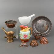 Koperen zeef en vijf puddingvormen, barbotine schenkkan met bloemdecor, Frankrijk, witte porseleinen vijzel met stamper, en bronzen vijzel met stamper -gebruikssporen-, zeef Ø 31 cm