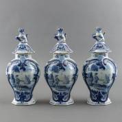 Driedelig Delfts aardewerk kaststel met blauw-wit decor van man met stok, kijkend naar zeilschip, de deksels bekroond door leeuw met bal, gemerkt De Lampetkan, 18e eeuw -vele defecten-, hoogte 34 cm