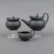 Driedelig basaltware theeservies, bestaande uit: theepot, melkkan en bedekte suikerpot, uitvoering Wedgwood -tuit gelijmd-, theepot 13 × 22 × Ø 13 cm