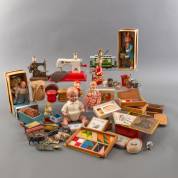 Divers oud speelgoed, waaronder opwindbare blikken 'Rabbit Drummer', eend op fiets, popjes, Glocke und Hammer spel, twee naaimachientjes, tinnen soldaatjes, etc., -bespeeld en defecten-, 22cm