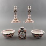 Divers Makkumer aardewerk met polychroom decor, bestaande uit: paar kandelaars, theebus en twee kommen, uitvoering Tichelaar, kandelaars 21,5 cm