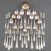 Achtpersoons verzilverd bestek, Hollands glad, uitvoering Christofle, Parijs, bestaande uit: acht dinercouverts, acht dessertcouverts en een soepdienlepel