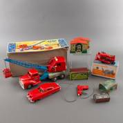 Divers speelgoed, waaronder: kraanwagen, model 285-285/1, uitvoering Gama, West-Duitsland, 'Blaw Knox Bulldozer', uitvoering Dinky Toys, en twee spaarpotten -alle gebruikt, defecten-