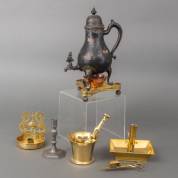 Divers kleingoed, bestaande uit: tinnen kraankan op messing komfoor, tinnen kandelaar, messing blaker, messing wandblaker, messing snuiter en messing vijzel met stamper -gebruikssporen-, kraankan 37 × Ø 14 cm