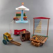 Steiff: toonbank display carrousel, metalen kiepwagen, kolenwagon, daarbij: houten schaakbord met schaakstukken, houten telraam, en hondenwagen -intensief bespeeld, caroussel staat scheef-, 37 cm