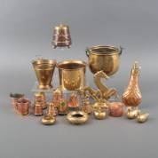 Divers klein koperwerk, waaronder: miniatuur doofpotjes, kruithoorn, emmertjes etc. -defecten-, kruithoorn 21 cm