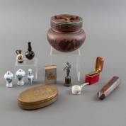 Divers kleingoed, waaronder: rood marokijnen tondeldoosje, gefacetteerde vulkaan-jaspis, Chinees porseleinen miniatuurvaasjes, Kangxi, etc. -defecten aan miniatuurvaasjes-