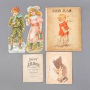 Drie kinderboeken: Schenkman, J. 'Nieuw A.B. boek naar een oud rijmpje en op een aardig wijsje'. Amsterdam, Th. Bom, circa 1880. Kl.8vo. Met 26 chromolithografieën; S. Andriessen. 'Klein zusje'. Circa 1900. Folio. Prentenboek; 'Handschaduwboekje met 16 voorbeelden'; En: 2 gestanste figuren van een jongen en een meisjes. Circa 1900. 23 × 14 cm -omslag van 2de titel vlekkerig-