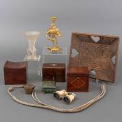 Drie houten theedozen, Japanse messing kandelaar met decor van kraanvogel op schildpad, houten dienblad, groen natuurstenen dekseldoosje met salamander op het deksel, persglazen vaasje, toneelkijker, bronzen sluitgewicht, en zilverkleurige uniform aiguilette -gebruikssporen-, kandelaar 21,5 cm