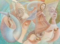 Valentine Okon Efiong (1958-2021), surrealistische compositie, olieverf op board, r.o. gesigneerd en gedateerd '90, 99 × 133 cm