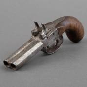 Dubbelloops penvuurpistool met hexagonale lopen en notenhouten kolf, midden 19e eeuw, 18 × 10 × 3,5 cm