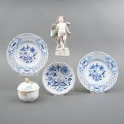 Porseleinen beeldje: treurende cupido vastgebonden door rozen, bedekte suikerpot met strooibloemen, de knop in de vorm van een rozenknop, schoteltje met uiendecor, en paar bordjes met opengewerkte rand en uiendecor, alle gemerkt Meissen, 19e/20e eeuw -beeldje met afgebroken vingers en groene bladeren, scherf van knopje van suikerpot en chip van de standring, schoteltje met randchips-, hoogte beeldje 18 cm