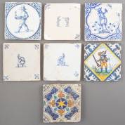 Zeven diverse tegels: dikke polychrome ornamenttegel, polychrome musketier, twee figuren omringd door meanders, en drie met kleinere hoekmotiefjes, alle 17e eeuw -enkele gerestaureerde hoeken, twee gelijmd-