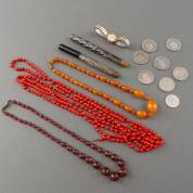 Drie kralen colliers aan onedele sluitingen, verguld stalen damespolshorloge met octagonaal gevormde kast aan fixo-flex-rekband, twee vulpennen, waarvan één met 14kt gouden punt en enkele munten