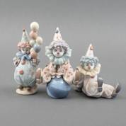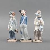 Drie porseleinen beeldjes: clowns, waarvan twee met muziekinstrument, model 5471 en 5472, uitvoering Lladró, en één zonder muziekinstrument -bij deze één bloemblaadje afgebroken-, uitvoering Nadal, 23 cm