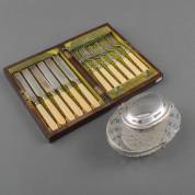 Zes verzilverde viscouverts met 1e gehalte zilveren aanzet en benen heften in houten cassette, kristallen suikermand met 2e gehalte zilveren greep, en kristallen theedoos met 2e gehalte zilveren deksel, suikermand 15 × 17 cm
