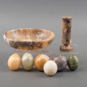 Verzameling natuurstenen eieren en ballen in natuurstenen schaal, daarbij: stenen breche d'alep vaasje, vaasje 13 cm