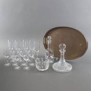 Divers kristal: twee karaffen, zes wijnglazen, kom en acht champagneflûtes, op verzilverd dienblad