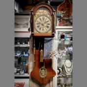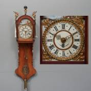 Friese staartklok in eiken kast, de wijzerplaat beschilderd met decor van visser, bekroond door metalen bazuinengelen en Atlas, 19e eeuw -gebruikssporen-, 125 × 40 × 20 cm