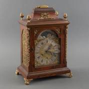Tafelklok in wortelnotengefineerde kast, met maanaanduiding en Romeinse cijfers, adres: Thomas Leeds, London, tweede helft 20e eeuw, 45 × 29 × 19 cm