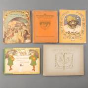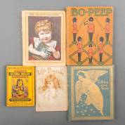 Vijf kinderboeken: 'The infant's Magazine'. (Nursery tales, etc.). Forty pages of coloured illustrations. Eind 1800; 'The Infant's Magazine'. Vol. XI. 1876. Geïllustreerd met handgekleurde houtgravures; 'Bo-Peep'. 1898; 'Lullabies of many lands. Collected by A. Strettel'.1896. Met 77 illustraties door E.J. Harding; Enz. Oorspr. banden -kleine defekten-