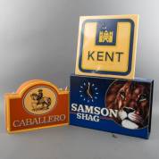 Drie kunststof lichtreclames: 'Samson shag' met klok, 'Caballero', en 'Kent cigarettes', 20e eeuw -gebruikssporen en defecten-, grootste 39 × 59 × 11 cm