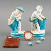 Paar porseleinen vaasjes in de vorm van putti -één mand gelijmd en kleine andere defecten-, drie faience scarabeeën, rond fotolijstje met micromozaïek, en lederen foedraaltje