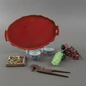 Paar Chinees porseleinen kommetjes met blauw-wit bloemdecor, 18e eeuw, Perzische tegel met vogeldecor, twee natuurstenen druiventrossen, metalen betelschaar, op beschilderd houten dienblaadje, 32 cm