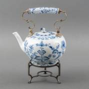 Porseleinen theepot met blauw-wit Zwiebelmuster, uitvoering Meissen, 1815-1888 -klein chipje naast deksel-, 15 × Ø 20 cm exclusief hengsel en tuit, daarbij: komfoor zonder brander
