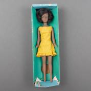 Kunststof pop in doos, model Nancy, uitvoering Bella, Frankrijk, midden jaren '60, vroege pop met Afrikaans uiterlijk, hoogte 30 cm, daarbij: een niet toebehorende doos van een Mattel Stacey pop