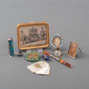 Diverse kleinoden: geëmailleerd snuifdoosje, parelmoer balboekje, twee kleine fotolijstjes, kleine litho van twee mensen met draagstoel, agaten briefopener, jade hanger met feniks decor, BWZG naaldenkoker, parfumflacon en kleine metalen Boeddha, litho met lijst 9,7 × 11,7 cm