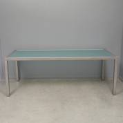 Rechthoekige tafel met gesatineerd glazen blad op metalen onderstel, modern -lichte gebruikssporen-, 76,5 × 210 × 90 cm