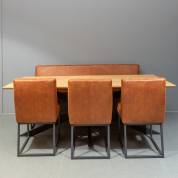 Tafel met eiken blad en gekruiste stalen poten, plus drie stoelen en een bank met bruin lederen bekleding, tafel 74 × 200 × 100 cm