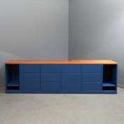 Groot blauwgelakt wandmeubel met diverse lades en vakken met blinde sluiting, het kersenhouten bovenblad voorzien van gat voor bedrading, modern -één lade wat stroef, lichte gebruikssporen-, 76 × 271 × 50 cm