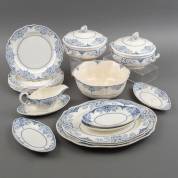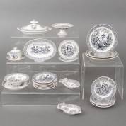 Aardewerk serviesgedeelte met blauw-wit transferdecor, model Primula, uitvoering Wedgwood, eind 19e/begin 20e eeuw, bestaande uit: zes dinerborden, twee dekselterrines, kom, drie grote dienschalen, drie kleine dienschalen, en saucière -enkele chips en verkleuringen-