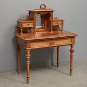 Eiken damesbureau met opstand, centraal gezet met kwikspiegel, onder het blad een lade en uittrekbaar schrijfblad met rood vilt, circa 1890 -gebruikssporen, spiegel aangetast-, 128 × 100 × 59 cm