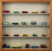 Wandvitrinekastje met daarin twintig speelgoedauto's, veelal Lesney, 52 × 52 cm