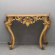 Goudgeschilderde houten wandtafel, het onderstel gedecoreerd met bladmotieven, Louis Quatorze-stijl, 20e eeuw -gebruikssporen en enkele kleine defecten-, 98 × 145 × 55 cm