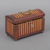 Mahonie theedoos met ingelegd streepdecor, het interieur met drie messing theebussen, eind 18e eeuw -theebussen met defecten-, 14 × 19 × 10 cm