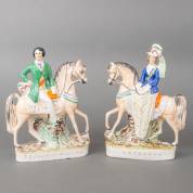 Paar polychrome aardewerk figuren: Edward VII en Alexandra te paard als Prince en Princess of Wales, Staffordshire, circa 1865 -Edward met klein chipje van standring; Alexandra met chipje van jurk en gelijmd paardenbeen-, 33 × 24 × 7 cm
