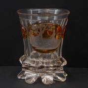 Boheems waterglas met geel überfangdecor van de jacht, en verso de datering 1837 -chipje in voet-, hoogte 12,2 cm