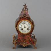 Pendule in schildpadbelijmde kast met bronzen ornamenten, Frankrijk, 19e eeuw -uurwerk zit los in de kast, messing inlegwerk ontbreekt-, hoogte 32 cm